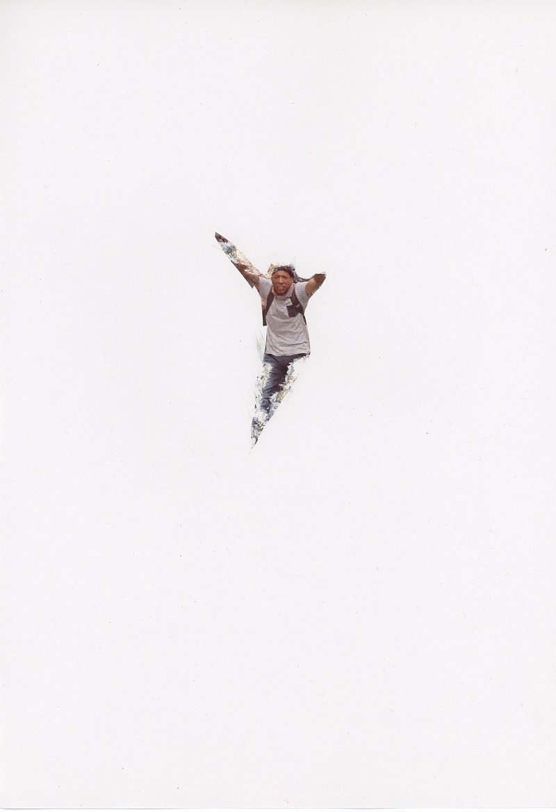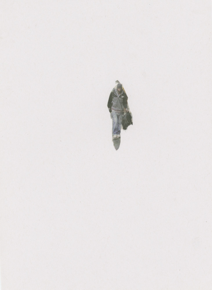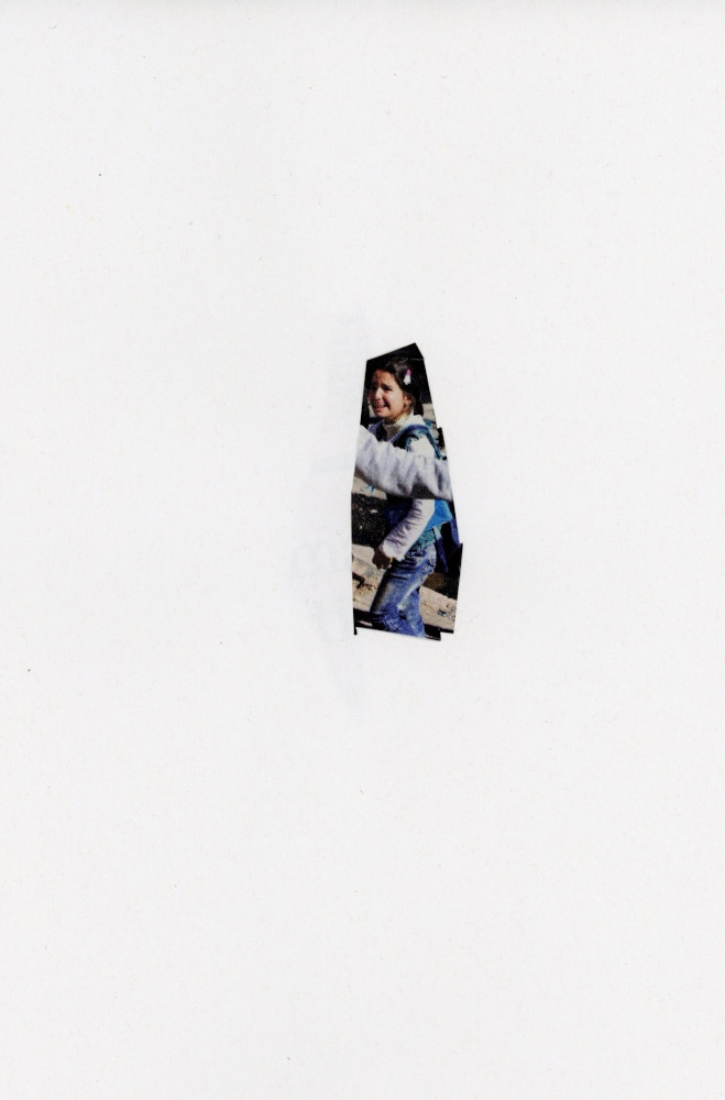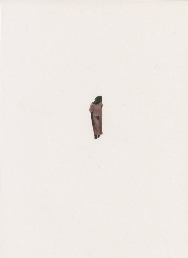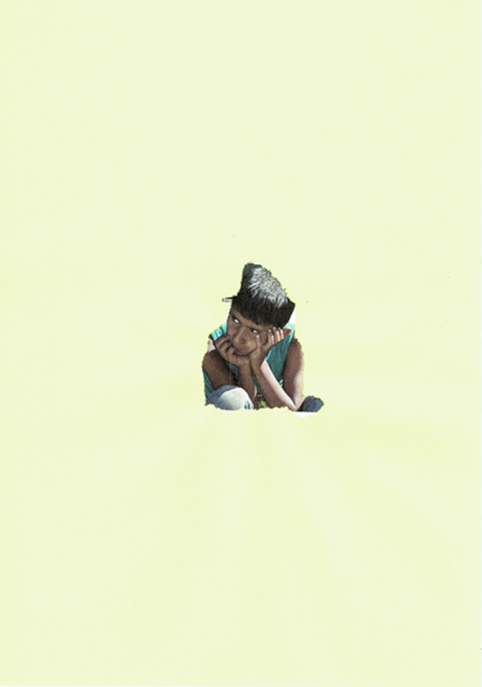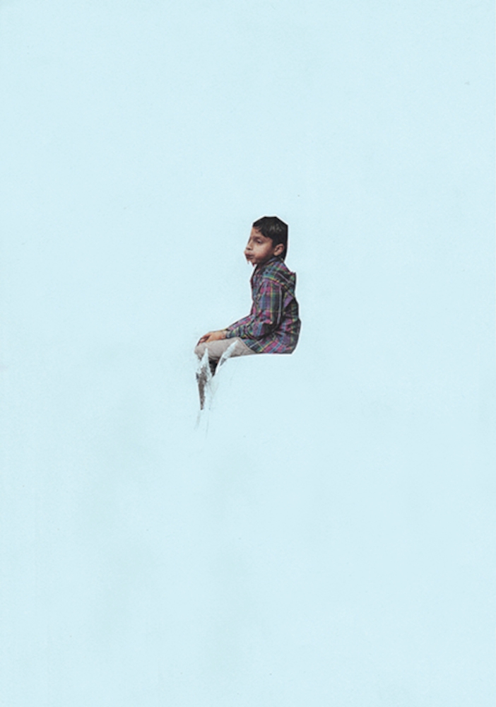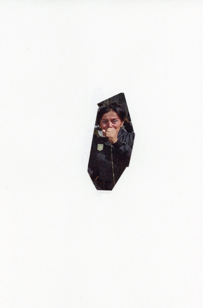En 2012, j’ai commencé une collection d’images issues de journaux quotidiens internationaux. Ce sont des images mettant en scène des personnages plongés dans des contextes de guerre et de déplacement. Je découpe les silhouettes, les retire du paysage dans lequel elles se trouvent, puis je les colle sur une nouvelle feuille, dans un décor inédit. C’est un exercice répétitif et presque quotidien de collection, découpage, décontextualisation et libération.
